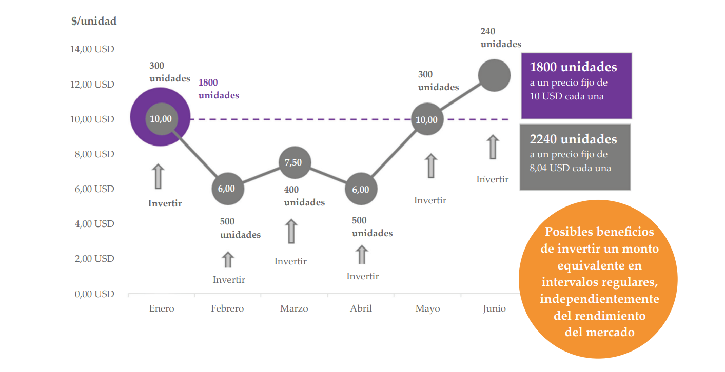 Sus pagos no solo son más asequibles si contribuye con pagos a sus ahorros a lo largo del tiempo, sino que también disfruta de los beneficios del promedio del costo en dólares. Esta estrategia le permite comprar más acciones cuando el precio es más bajo y menos acciones cuando el precio es alto, lo que podría reducir su precio promedio con el tiempo y disminuir su sensibilidad a las caídas del mercado.